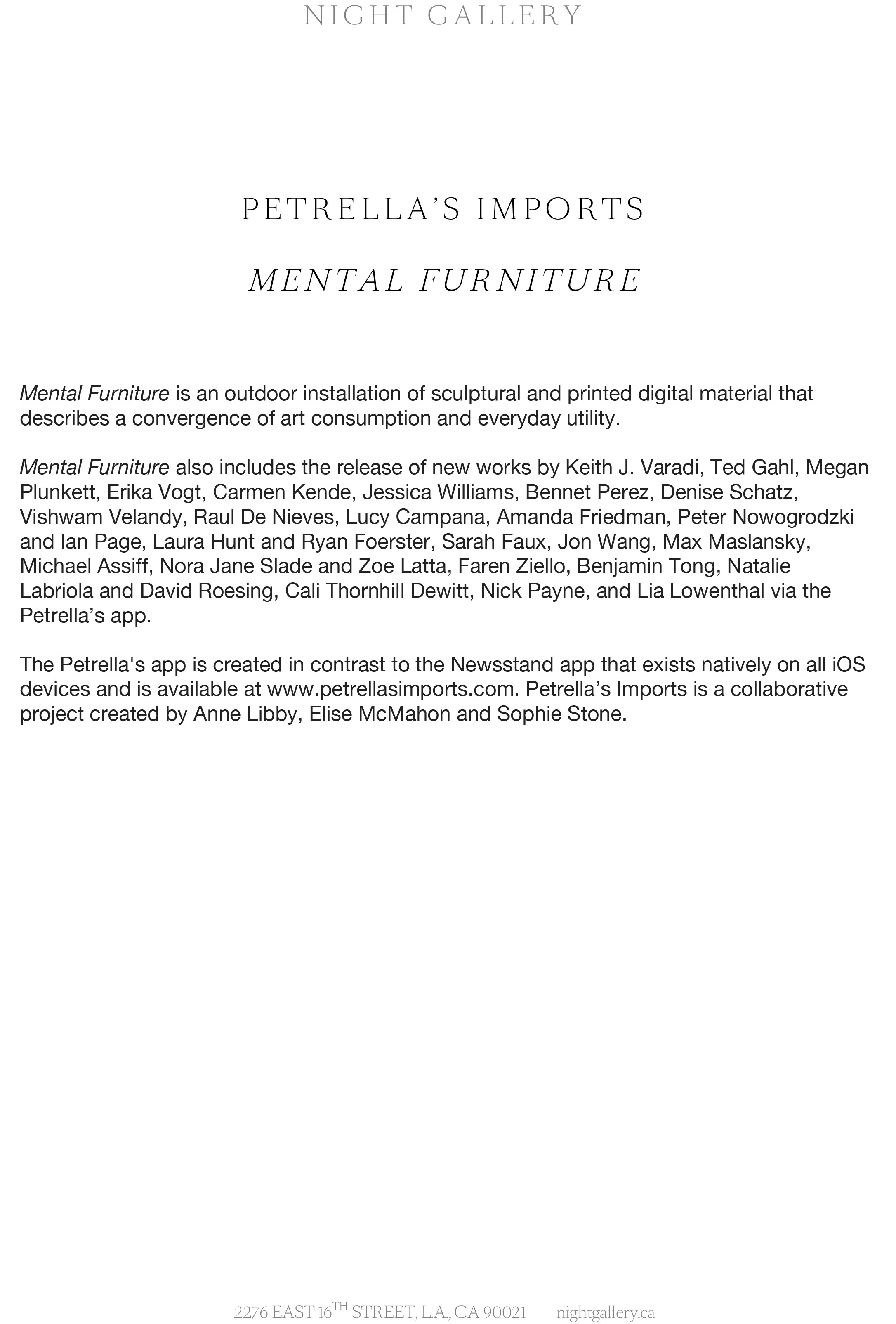 Mental Furniture also includes the release of new works by Keith J. Varadi, Ted Gahl, Megan Plunkett, Erika Vogt, Carmen Kende, Jessica Williams, Bennet Perez, Denise Schatz, Vishwam Velandy, Raul De Nieves, Lucy Campana, Amanda Friedman, Peter Nowogrodzki and Ian Page, Laura Hunt and Ryan Foerster, Sarah Faux, Jon Wang, Max Maslansky, Michael Assiff, Nora Jane Slade and Zoe Latta, Faren Ziello, Benjamin Tong, Natalie Labriola and David Roesing, Cali Thornhill Dewitt, Nick Payne, and Lia Lowenthal via the Petrella’s app.